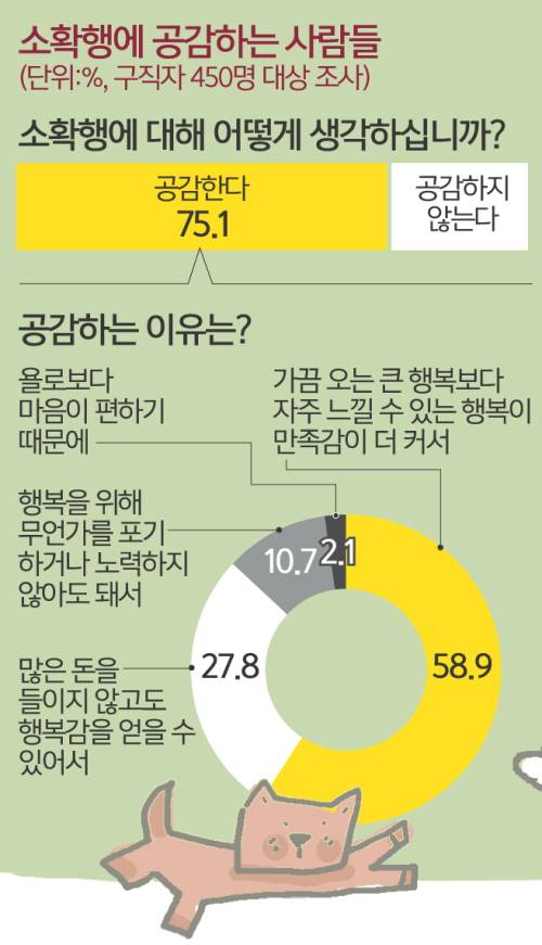 부(富)와 명예, 성공과 같은 거창한 목표를 통해 커다란 행복을 바라기 보다는 큰 비용이나 노력을 들이지 않고도 얻을 수 있는 작은 행복을 찾으려는 사람들이 많아지고 있는 것입니다.