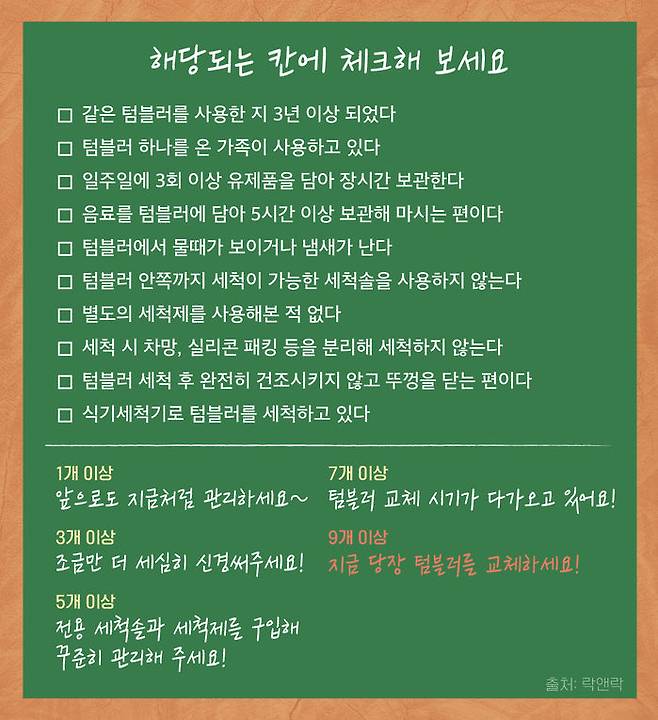 체크 리스트의 10가지 항목 중 해당되는 것이 없다면 텀블러 관리를 잘 하고 있는 건데요. 5개 이상에 표시했다면, 텀블러 전용 세척솔과 세척제를 구입해 지금부터라도 꾸준히 관리하는 게 좋습니다. 만약 9개 이상에 해당한다면, 사용 중인 텀블러의 오염도가 높은 상태일 것이기 때문에 당장 새 것으로 교체해야 합니다.