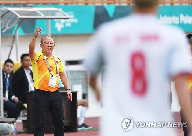 (브카시[인도네시아]=연합뉴스) 홍기원 기자 = 19일 오후(현지시간) 인도네시아 자와바랏주 브카시 치카랑의 위봐와 묵티 스타디움에서 열린 2018 자카르타-팔렘방 아시안게임 남자축구 조별리그 D조 베트남과 일본의 경기에서 베트남 박항서 감독이 작전을 지시하고 있다. 2018.8.19