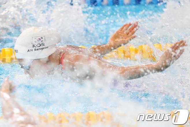(자카르타(인도네시아)=뉴스1) 임세영 기자 = 20일 오전 인도네시아 자카르타 겔로라 붕 카르노(GBK) 아쿠아틱센터에서 열린 2018 자카르타·팔렘방 아시안게임 여자 50M 접영 예선에서 안세현이 역영을 하고 있다. 2018.8.20/뉴스1