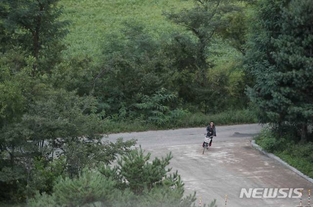【금강산=뉴시스】김진아 기자 = 이산가족 상봉행사 1회차 마지막날인 22일 북한 외금강호텔에 북한 주민이 자전거를 타고 이동하고 있다. 2018.08.22.