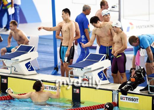 [마이데일리 = 자카르타 곽경훈 기자] AG 남자수영이 22일 오전 (한국시간) 인도네시아 자카르타 겔로라 붕 카르노(GBK) 수영장에서 진행된 '2018 카르타-팔렘방아시안게임' 남자 계주 경기 예선을 마친뒤 이야기를 나누고 있다.