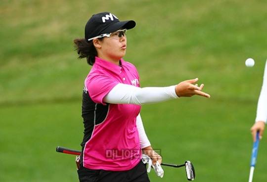 조정민(24,문영그룹)이 10번홀 퍼팅전 캐디에게 볼을 던져주고 있다./smfoto@maniareport.com