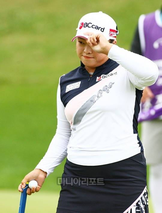 장하나(26,비씨카드)가 10번홀 홀아웃하며 갤러리에 인사하고 있다./smfoto@maniareport.com