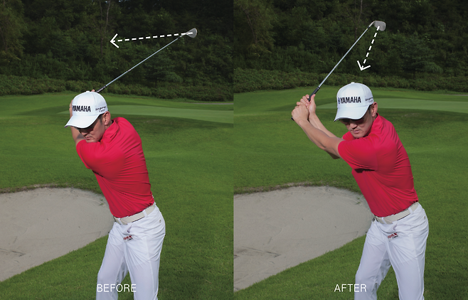 Point 3 마지막 세 번째는 가파르게 들어주는 백스윙입니다. 오른손이 뒤집어지고 그대로 접힌다는 느낌으로 가파르게 들어 올려야 합니다. 클럽페이스가 본인을 바라봐주는 모습이 돼야 올바르게 백스윙이 이루어진 상태입니다. 이후에 자신 있게 클럽을 내려놓으면서 스윙을 하면 바운스 각으로 모래를 튕겨내기가 굉장히 쉬워집니다.