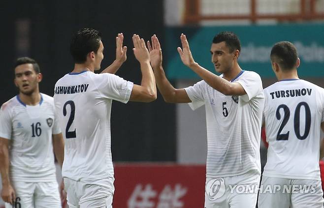 (치카랑[인도네시아]=연합뉴스) 서명곤 기자 = 23일 오후(현지시간) 인도네시아 자와바랏주 치카랑의 위바와 묵티 스타디움에서 열린 열린 2018 자카르타-팔렘방 아시안게임 축구 16강 우즈베키스탄과 홍콩의 경기. 3-0으로 승리한 우즈베키스탄 선수들이 기뻐하고 있다. 2018.8.23