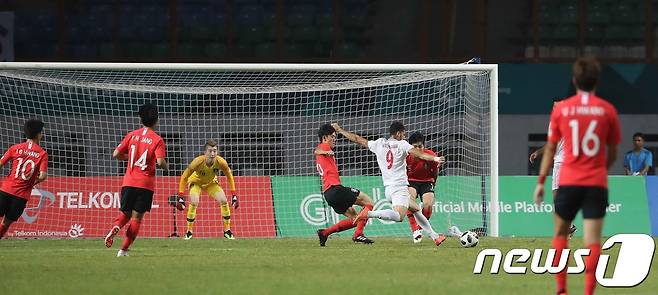 (치카랑(인도네시아)=뉴스1) 임세영 기자 = 23일 오후 인도네시아 자와바랏주 치카랑에 위치한 위바와 묵티 스타디움에서 열린 2018 자카르타·팔렘방 아시안게임 U-23 남자축구 16강전 대한민국과 이란의 경기에서 대한민국 선수들이 수비를 하고 있다. 2018.8.23/뉴스1