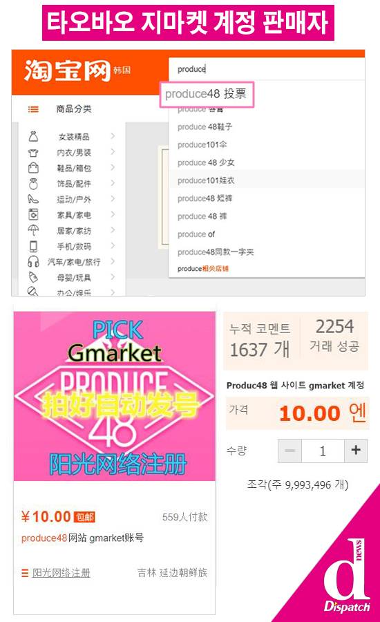 '디스패치'는 중국 타오바오 사이트에 접속했다. 검색창에 'produce'를 입력했다. 'produce 投票'이 자동으로 완성됐다.