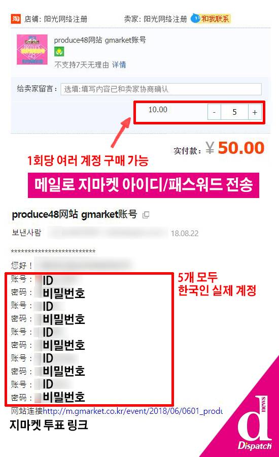 '디스패치'는 50위안을 주고 아이디(&비번) 5개를 샀다. 이어 '지마켓' 로그인을 시도했다. 5개 모두 접속 및 투표가 가능한 실제 계정이었다.