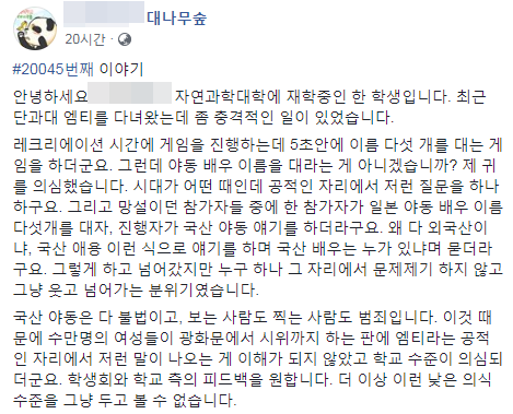 23일 지역 명문 대학교 대나무숲에는 자연과학대학에서 진행한 MT에 참석했다 불쾌한 일을 겪은 A씨 얘기가 실렸다. 게시물에 따르면 레크리에이션 시간에 게임을 하던 중 진행자인 남자선배 B씨가 한 학생에게 야동 배우 이름을 대라고 했다. 망설이던 해당 학생이 유명 일본 AV배우 이름을 대자, B씨는 “왜 다 외국산이야? 국산 애용해야지. 국산 배우는 누가 있지?”라고 했다. A씨는 ‘어떤 시대인데 공적인 자리에서 저런 말을 하지’란 의문이 들었지만 당시 MT에 참석했던 학생들 모두 웃고 넘어가는 분위기였다고 한다.