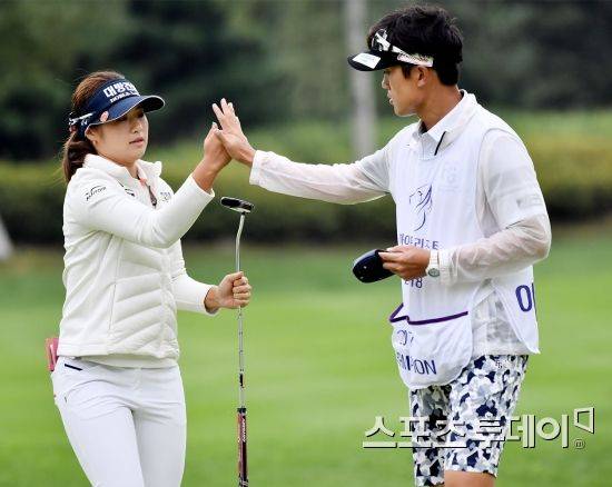 [정선(강원)=스포츠투데이 팽현준 기자] 25일 강원도 정선 하이원 컨트리클럽에서 열린 '하이원리조트 여자오픈 2018' 2라운드, 이정은6이 11번홀 버디를 잡고 캐디와 하이파이브를 하고 있다. 2018.08.25.