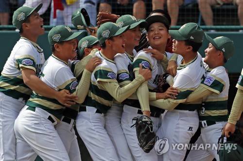South Korea pitcher Yeong Hyeon Kim, second from right, celebrates with teammates after getting the final out of the International Championship baseball game against Japan at the Little League World Series tournament, Saturday, Aug. 25, 2018, in South Williamsport, Pa. Korea won 2-1. (AP Photo/Gene J. Puskar)