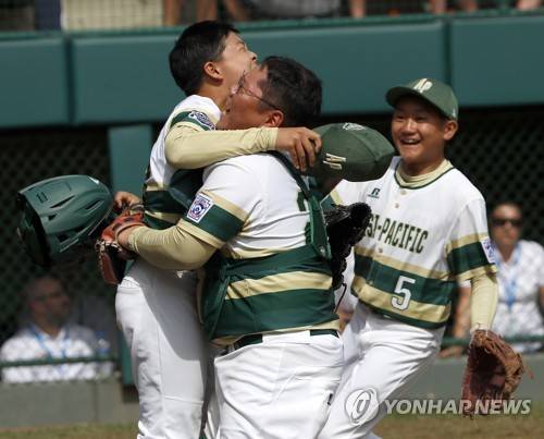 South Korea's pitcher Yeong Hyeon Kim (14) celebrates after the final out against Japan with catcher Gi Jeong Kim and third baseman Tae Hyun Kim (5) in the International Championship baseball game at the Little League World Series tournament, Saturday, Aug. 25, 2018, in South Williamsport, Pa. South Korea won 2-1 to advance to the World Series Championship Game Sunday. (AP Photo/Tom E. Puskar)