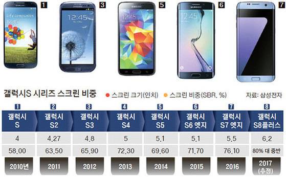 모바일 기술 발전도 이유다. 커브드(구부러지는 형태) 디스플레이, 지문 인식내장, 제로 베젤(Bezel‧테두리) 등 단말기 크기를 키우지 않고 화면만 확대하는 다양한 기술이 발달했다. 덕분에 스마트폰의 단말기 대비 화면 비율(SBR·Screen to Body Ratio)은 꾸준히 커지고 있다.