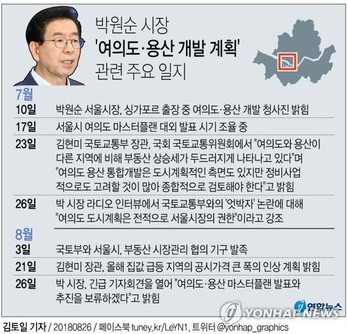 박 시장은 이날 회견에서 "여의도·용산 개발은 이미 이전에도 발표한 내용이고, 추진하는 데 시간이 걸리는 사업"이라며 "그럼에도 이 계획이 재개발 관점으로 해석되고, 관련 기사가 확산하며 부동산 과열 조짐이 생기는 하나의 원인이 됐다"고 말했다.