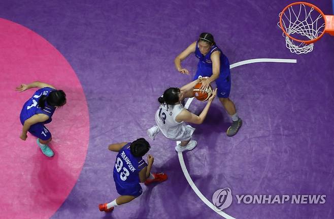 (자카르타=연합뉴스) 김주성 기자 = 26일 오전(현지시간) 인도네시아 자카르타 겔로라 붕 카르노(GBK) 농구장에서 열린 2018 자카르타·팔렘방 아시안게임 여자농구 8강전 남북단일팀 대 태국 경기에서 김소담이 슛동작 중 파울을 당하고 있다. 2018.8.26