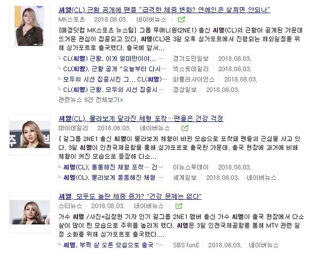 | ▲ 가수 씨엘(CL)에 대한 기사들. 외모에 대한 난도질에 가까웠다 |
