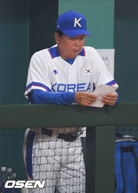 [OSEN=자카르타(인도네시아), 손용호 기자] 26일 오후(한국시간) 인도네시아 자카르타 겔로라 붕 카르노(GBK) 야구장에서 열린 2018 자카르타-팔렘방 아시안게임 야구 예선 B조 한국과 대만의 경기, 7회말 계속되는 무득점에 선동렬 감독이 선수명단을 바라보고 있다. / spjj@osen.co.kr