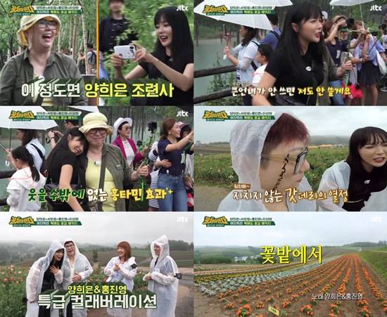 이날은 비가 오는 등 여행을 하기엔 다소 아쉬운 날씨였다. 처질 수 있는 분위기였지만 홍진영은 자신이 먼저 나서 인생샷을 찍어주는 등 즉석에서 흥을 띄우면서 멤버들과 함게 여행을 즐겼다. 맏언니 양희은에게도 애교있게 대하는 그의 모습은 또 한 번의 훈훈한 케미를 발산하기에 충분했다.