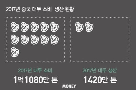 중국의 지난해 대두 소비는 1억1080만 톤으로 전 세계(3억4380만 톤)의 32%를 차지했다. 중국의 지난해 대두 생산은 1420만 톤(4.2%)으로 세계 4위지만 수요에 비해 공급이 상당히 부족하다. 이에 따라 중국은 매년 9600만 톤 이상의 대두를 수입해야만 한다. 수입의존도가 무려 87.2%에 달한다. 지난해 기준으로 중국이 콩을 가장 많이 수입한 국가는 브라질로 전체의 52.8%를 차지했다. 그다음으로 많은 국가가 35.1%를 차지한 미국이다. 금액으로는 140억 달러에 달한다.