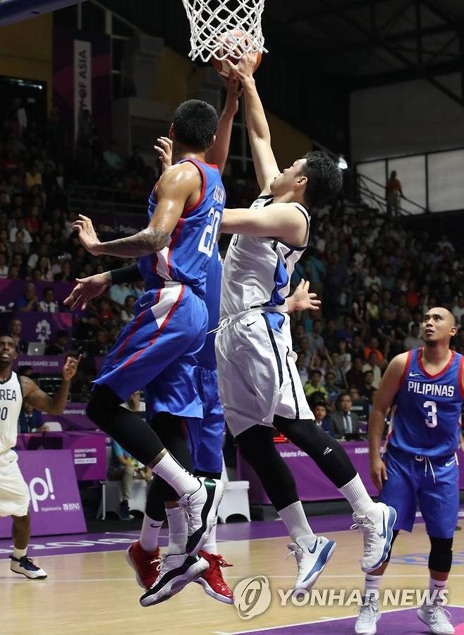 (자카르타=연합뉴스) 서명곤 기자 = 27일 오전(현지시간) 인도네시아 자카르타 겔로라 붕 카르노(GBK) 농구장에서 열린 2018 자카르타·팔렘방 아시안게임 남자농구 8강전 한국과 필리핀의 경기. 이승현이 슛을 쏘고 있다.2018.8.27