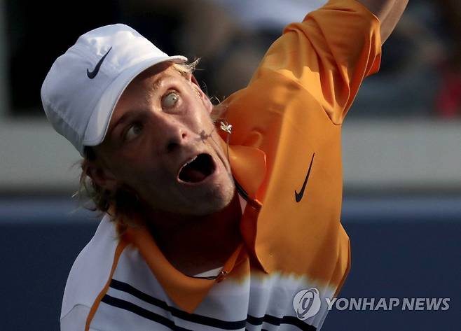(뉴욕 AP=연합뉴스) 미국 뉴욕의 킹 내셔널 테니스센터에서 27일(현지시간) 개막한 2018 US오픈 테니스대회 남자단식 1회전에서 데니스 샤포발로프(캐나다)가 상대 펠릭스 오거-알리아시메(캐나다)에게 서브를 넣고 있다.