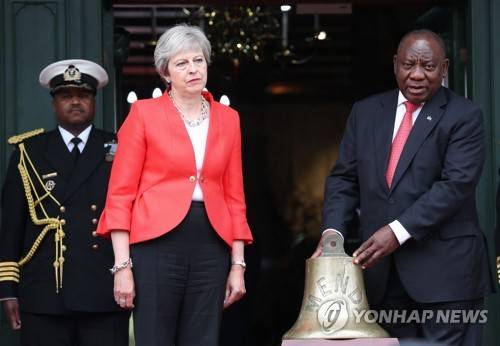 epa06978315 South African President Cyril Ramaphosa (R) and British Prime Minister Theresa May (L) during an official welcoming ceremony in Cape Town, South Africa, 28 August 2018. The visit is the first visit by a British Prime Minister to Sub-Saharan Africa since 2013. She is visiting South Africa, Nigeria and Kenya meeting with business leaders and her counterparts in government with a central message of renewed partnership between Britain and Africa. EPA/MIKE HUTCHINGS / POOL
