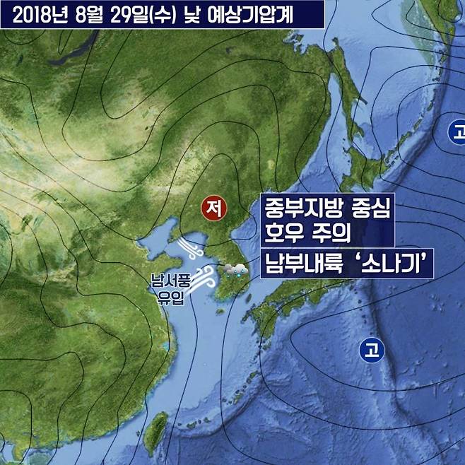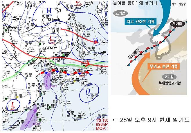 기상청은 “우리나라 북쪽에 저기압이 위치하면서 차가운 공기가 북서쪽에서 유입되고 북태평양고기압 가장자리를 따라 덥고 습한 남서풍이 유입되면서 정체전선이 형성돼 비가 내리고 있다”고 설명했다. 저기압은 반시계방향으로 공기를 이동시켜 찬 공기가 북서쪽에서 한반도로 내려오고, 고기압은 시계방향으로 공기를 이동시켜 남서쪽 바다의 습하고 더운 공기를 한반도로 밀어올린다는 설명이다.