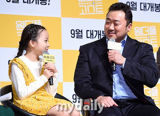 [마이데일리 = 김정수 기자] 29일 오전 서울 강남구 신사동 CGV압구정에서 진행된 영화 '원더풀 고스트' 제작보고회에 참석한 배우 마동석이 아역배우 최유리가 무대에 등장하자 환한 아빠미소를 자아냈다.
