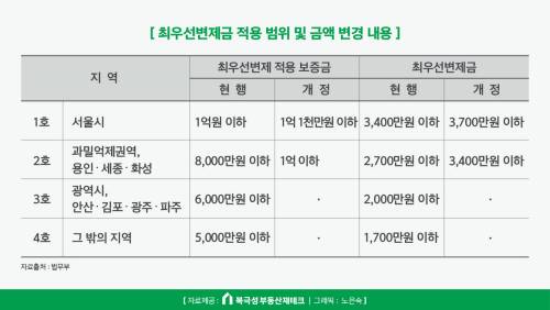 과밀억제권역, 용인, 세종, 화성시의 경우 최우선변제를 받을 수 있는 임차인의 범위가 현재 보증금 8,000만원 이하에서 1억원 이하로 넓어지고, 최우선변제금은 현재 2,700만원 이하에서 3,400만원 이하로 증액되었습니다.