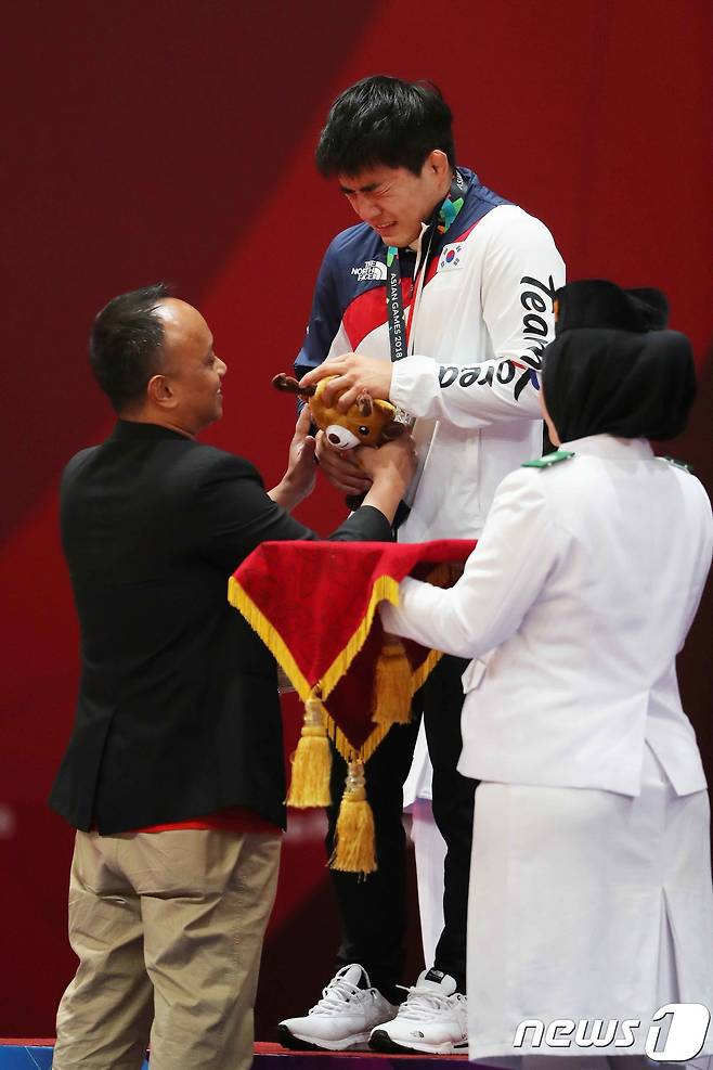 (자카르타(인도네시아)=뉴스1) 임세영 기자 = 30일 인도네시아 자카르타 컨벤션센터에서 열린 2018 자카르타·팔렘방 아시안게임 남자 유도 -73kg 메달 세리머니에서 안창림이 은메달을 목에 걸고 눈물을 흘리고 있다. 이날 안창림은 결승전에서 일본의 오노 쇼헤이에게 석연치 않는 심판 판정으로 패하며 은메달에 머물렀다. 2018.8.30/뉴스1