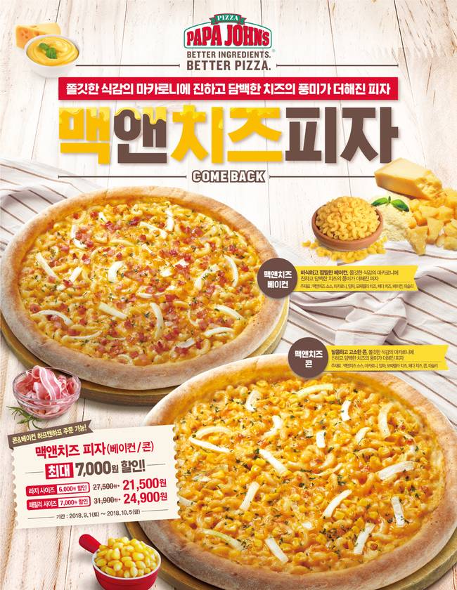 한국파파존스가 '맥앤치즈' 피자 2종을 다시 선보인다.
