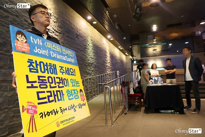 | ▲ 노동인권 있는 드라마 현장 촉구 한빛미디어노동인권센터 탁종렬 소장이 26일 오후 tvN 새 토일드라마 <미스터 션샤인> 제작발표회가 열리는 서울 논현동의 한 웨딩홀 1층에서 '노동인권이 있는 드라마 현장'을 촉구하는 드라마 세이프(Drama Safe) 1인시위를 하고 있다. |