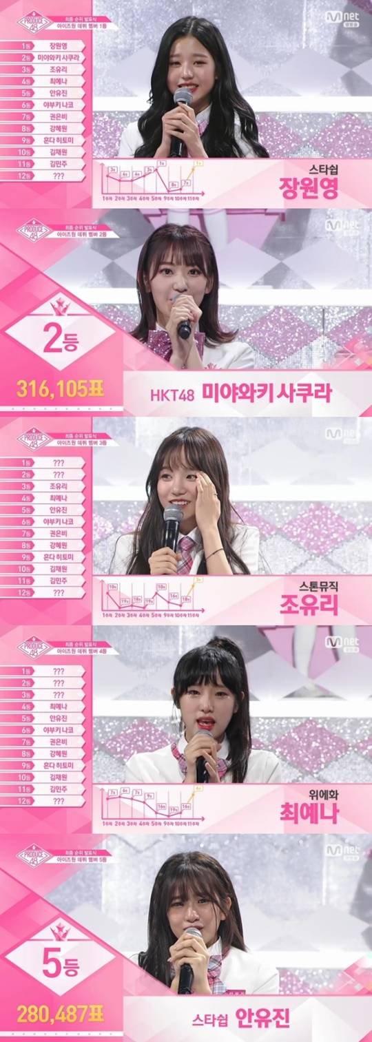 최종 순위가 발표됐다. 11등 얼반웍스 김민주, 10등 울림 김채원, 9등 AKB48 혼다 히토미, 8등 에잇디 강혜원, 7등 울림 권은비, 6등 HKT48 야부키 나코, 5등 스타쉽 안유진, 4등 위에화 최예나, 3등 스톤뮤직 조유리, 2등 HKT48 미야와키 사쿠라가 이름을 올렸고, 1등이자 '아이즈원'의 센터는 장원영이 차지했다. 마지막으로 12등의 주인공은 WM 이채연이었다.