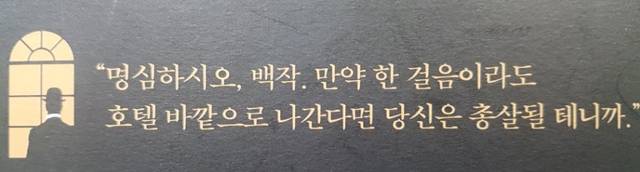 당 고위 관료들의 중요한 회의가 호텔의 한 방에서 은밀하게 열리고, 스탈린이 사망하고, 새로운 권력자들이 등장하지만 이 소설에서는 모두 조연일 뿐입니다. 웨이터 일을 하면서 소피야를 돌보고, 호텔에 머물고 있는 여배우와 로맨스까지 펼치는, 백작의 품위를 갖췄지만 이제는 웨이터인 로스토프가 주인공일 뿐이죠.