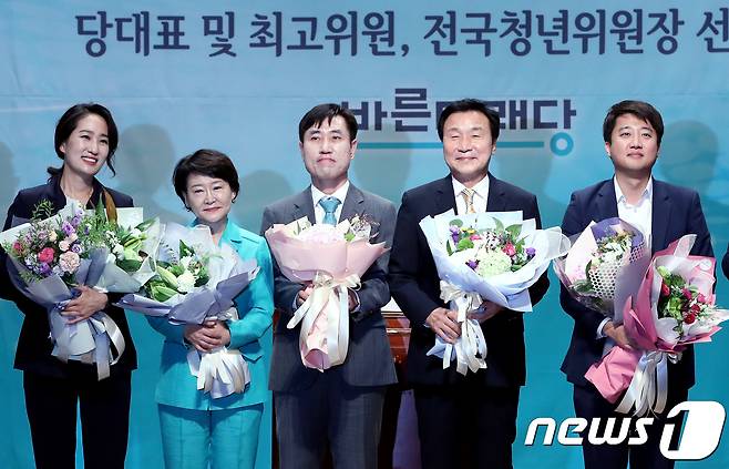 (서울=뉴스1) 박정호 기자 = 2일 오후 서울 여의도 국회 의원회관 대회의실에서 열린 바른미래당 당대표 및 최고위원, 전국청년위원장 선출대회에서 선출이 확정 된 김수민 전국청년위원장(왼쪽부터), 권은희 최고위원, 하태경 최고위원, 손학규 당대표, 이준석 최고위원이 손을 맞잡아 들어 인사하고 있다. 2018.9.2/뉴스1