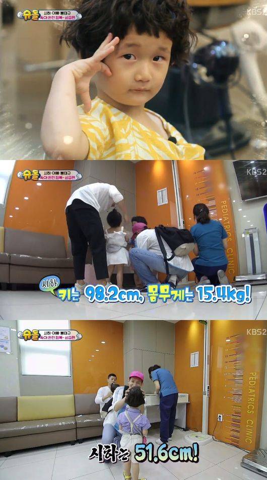 이어 예방접종을 위해 병원으로 향한 시하가 신체 사이즈를 잰 결과 키는 98.2cm, 몸무게는 15.4kg, 머리 둘레는 51.6cm으로 나왔다.