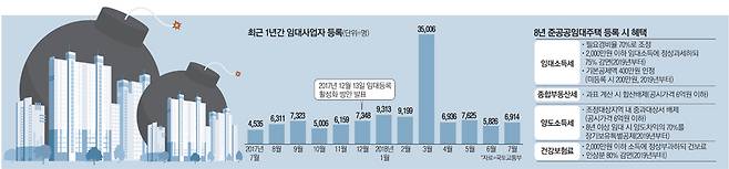 이런 맥락에서 지난해 12월 발표된 '다주택자 임대등록 활성화 대책'은 상당한 효과를 봤다. 작년만 해도 월평균 3000명이었던 임대사업등록자 수가 올해 1만1552명으로 급증했다. 올 들어 지난 7월 말까지 8만819명이 등록했다. 양도세 중과를 앞둔 3월 한 달 사이에만 무려 3만5006명이 등록하기도 했다. 지난달 기준 임대등록사업자는 약 33만6000명으로 이들이 등록한 임대주택은 총 117만6000여 가구이다.