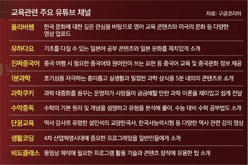 유튜브를 활용한 교육콘텐츠가 인기다. 이용자가 마음만 먹으면 언제 어디서나 무료로 양질의 교육을 받을 기회가 활짝 열린 셈이다. 영어와 일본어, 중국어 등 각종 외국어는 물론 과학, 역사, 스포츠 등 다양한 분야에서 전문지식과 교수·학습능력, 훌륭한 콘텐츠 등을 두루 갖춘 이른바 ‘유선생’(유튜브 속 선생님)들이 많기 때문이다.
