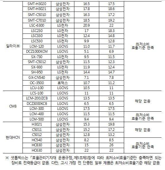 그동안 업계와 정부에서 이 문제를 해결하기 위해 어떤 노력을 했는지 취재하면서 상당히 강력한 규제가 들어와 있다는 걸 확인할 수 있었습니다. 2015년부터 셋톱박스에도 최저소비효율기준을 도입해 대기 전력에서도 일정 전력 기준을 넘기면 시판을 금지했습니다. 위반시에는 2천만 원 이하 벌금까지 부과할 수 있습니다. 고시를 찾아보니 케이블방송은 16W, IPTV는 12W, 위성은 13W였습니다. 하지만 전수 조사한 결과만 봐도 기준을 넘기는 셋톱박스는 여럿 찾아볼 수 있습니다. 판매 금지에 벌금을 부과해야 하는 건데 버젓이 유통되고 있었습니다.