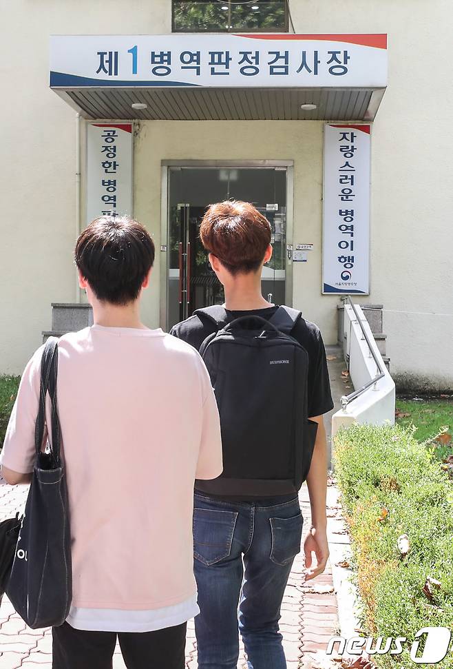 (서울=뉴스1) 성동훈 기자 = 아시안게임에서 금메달을 딴 남자 선수들의 병역 면제 혜택이 논란이다. 4일 서울 영등포구 서울지방병무청에서 병역대상자들이 병역판정검사를 받시 위해 병무청으로 들어서고 있다.