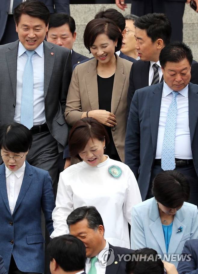 (서울=연합뉴스) 최재구 기자 = 부총리 겸 교육부 장관으로 내정된 더불어민주당 유은혜 의원과 여성부 장관으로 내정된 진선미 의원이 6일 제헌 70주년 기념사진 촬영을 위해 국회 본청 앞 계단으로 나서며 동료 의원들과 대화하고 있다. 2018.9.6