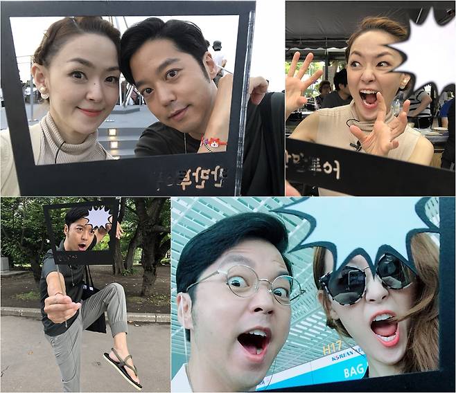 만화 컷을 연상시키는 여행 토퍼를 들고 찍은 김윤아-김형규의 독특한 셀카들이 공개돼 폭소를 유발하고 있는 것.