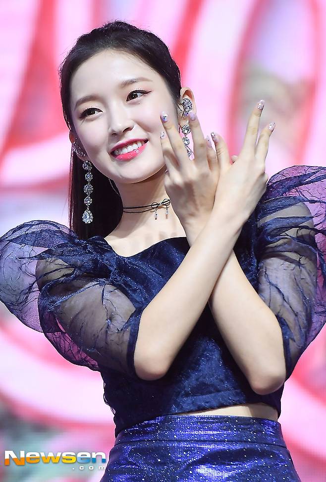 이날 오마이걸 아린이 포토 포즈에 응하고 있다.