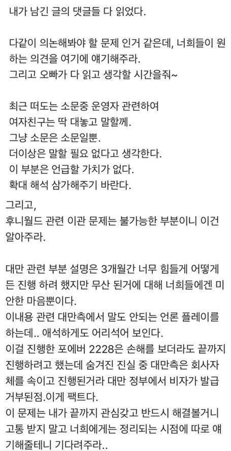 강성훈 모든 의혹을 전면 반박하고 있다. 그는 “운영자와 관련한 소문은 사실이 아니다”라고 강조했다. 대만 팬미팅 관련해서도 “대만 측에서 말도 안 되는 언론 플레이를 한다”며 “숨겨진 진실이 있다”고 주장했다.