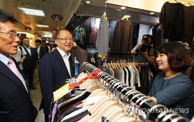 (서울=연합뉴스) 진성철 기자 = 자영업자 및 소상공인 세정지원 방안 알리기에 나선 한승희 국세청장이 11일 서울 중구 동대문 패션타운 제일평화시장을 찾아 한 상인과 대화하고 있다. 2018.9.11