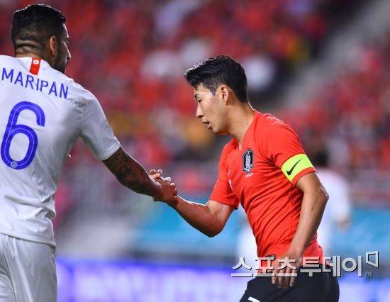 전반전 대한민국 손흥민이 상대 선수와 손을 잡고 있다. 2018.09.11.