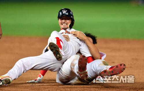 [포토]10회말 끝내기안타 김성현, 한동민의 안아넘기기