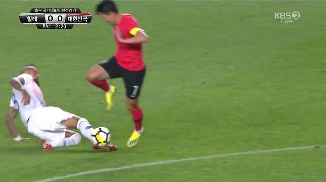 먼저, 아르투로 비달의 태클이 들어오자 손흥민은 공을 가볍게 들어 올리며 피했다. 이어 디에고 발데스가 손흥민에게 다가왔고, 손흥민은 뒷발을 이용해 발데스의 다리 사이로 남태희에게 패스했다. 손흥민은 2초 남짓한 짧은 시간 동안 이 연속 동작으로 탈압박에 성공했다.