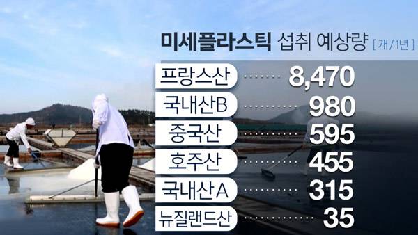 국내외 천일염 모두 미세플라스틱에서 자유롭지 못했다 아직 보도를 못 보신 분들을 위해 간단히 요약을 해 드리자면 보고서는 국내에서 시판 중인 국내산과 외국산 천일염 6종류를 분석한 결과, 모두 미세플라스틱이 검출됐다는 내용을 담고 있습니다. 100그램당 프랑스산은 242개. 국내산은 최고 28개, 중국산에서는 17개가 나왔습니다. 체 역할을 하는 필터는 150마이크로미터 크기까지 거를 수 있는 것을 사용했습니다. 1년에 8천 개?…사실은 훨씬 더 많다 우리나라 사람 한 명이 먹는 소금양은 1년에 3.5kg 정도로 추정됩니다. 앞서 이야기한 천일염을 주로 먹는다고 가정하면 400~500개에서 8천 개가 넘는 미세플라스틱을 먹는다는 계산이 나옵니다. 그런데 실제론 더 많은 양을 먹을 수 있습니다. 검출 실험에 사용한 필터가 150마이크로미터까지 거를 수 있는 필터였는데 이보다 더 작은 미세플라스틱이 훨씬 더 많기 때문입니다. 여기에 이미 밝혀진 것처럼 수돗물이나 어패류를 통해 먹을 수 있는 미세플라스틱까지 합치면 계산하는 것 자체가 무의미할 수도 있습니다.